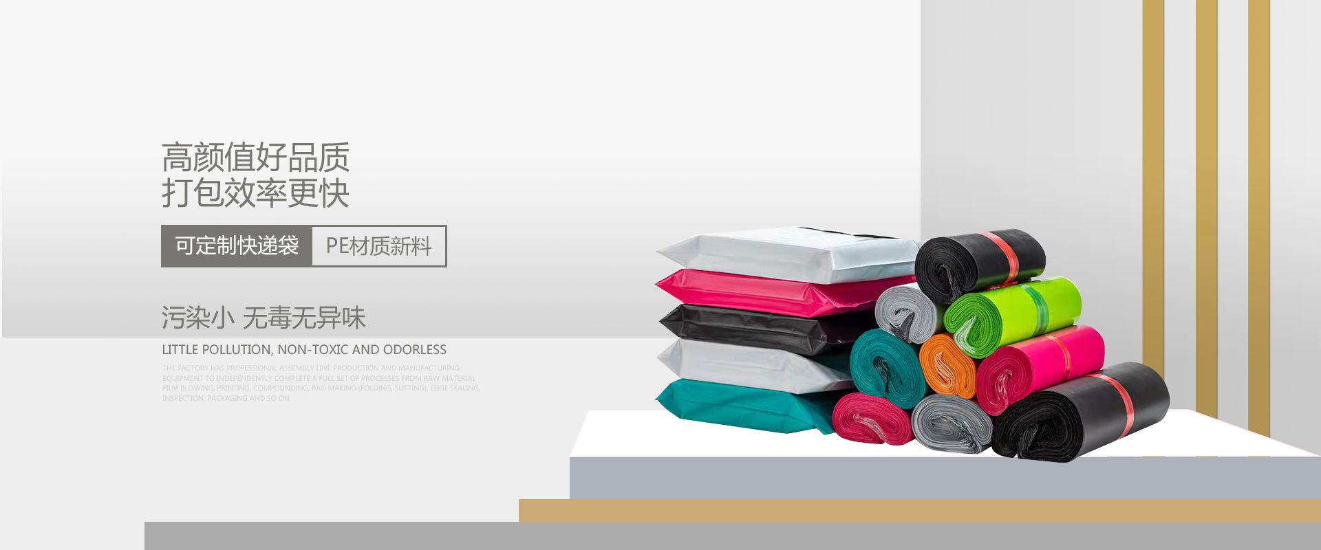 ADVANTAGE 凯玺工贸公司优势 现代化标准厂房 公司拥有现代化标准厂房近20000平方米,全面致力于塑料包装材料的开发、生产、销售和产业结构的优化调整。员工与企业同步发展。 经验丰富 诚信、实力和产品质量获得业界的认可。基于对自身数十年来生产销售的经验和广大客户的信赖,相信以我们产品质量和诚恳地服务态度能与业内外人士共创辉煌。 经营范围 公司主要生产PE快递包装袋,LDPE透明袋,PE膜,可降解购物袋,目前年产5000多吨各种包装袋,本公司产品质量稳定设备先进,拥有完整、科学的质量管理体系。 设计生产一条龙 工厂拥有流水线生产制造设备,独立完成从:原料吹膜、印刷、复合、制袋(折边、分切)、封边、检验、包装等等的全套工艺,可以根据客户的定制要求。提供一条龙服务。
